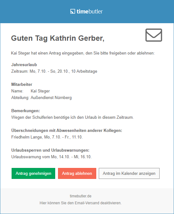 Wenn ein Mitarbeiter Urlaub eingibt, dann startet Timebutler den Genehmigungsworkflow. Der Vorgesetzte wird per Email über den Urlaubsantrag benachrichtigt. Falls dem Mitarbeiter