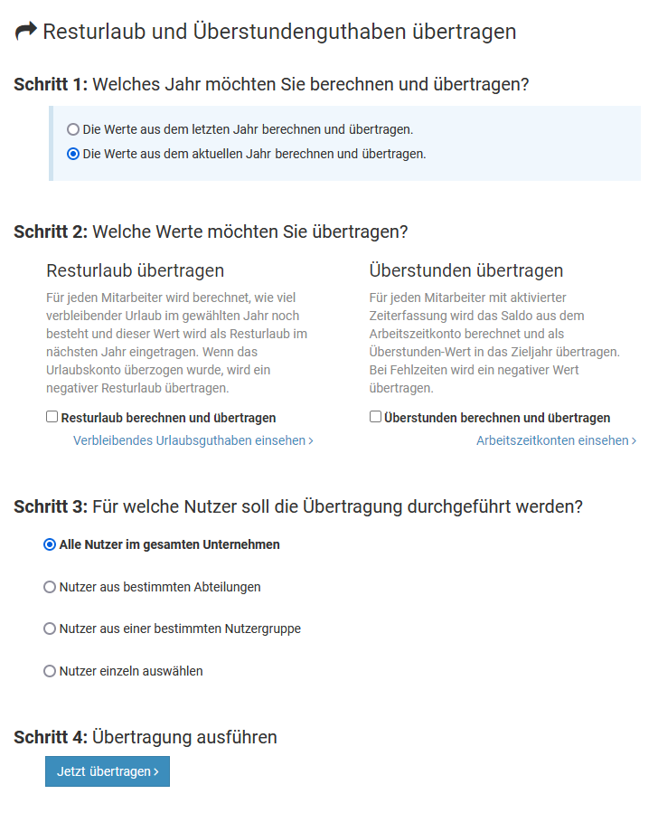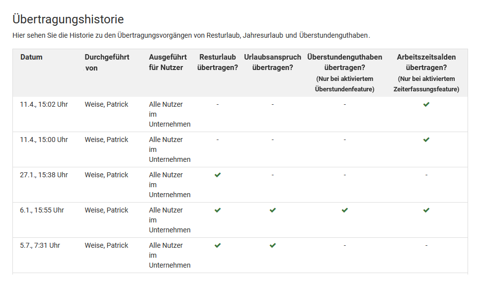 Der Resturlaub wird absichtlich nicht vollautomatisch in das nächste Jahr übertragen, unter anderem weil die Unternehmen den Resturlaubswert in manchen Fällen manuell bearbeiten möchten.