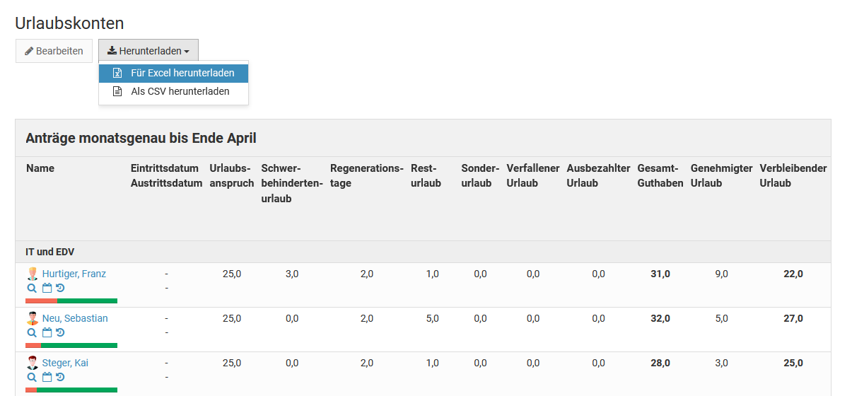Die Seite wird neu geladen und nun werden die Urlaubskonten angezeigt unter Berücksichtigung nur derjenigen Urlaubsanträge, die Sie im Filter eingestellt haben, also beispielsweise nur der Urlaubsanträge, die spätestens im Juni beginnen. In der Spalte "Verbleibender Urlaub" können Sie nun ablesen, wie viele Urlaubstage die Mitarbeiter im Anschluss noch übrig haben, also in dem Beispiel ab Juli.