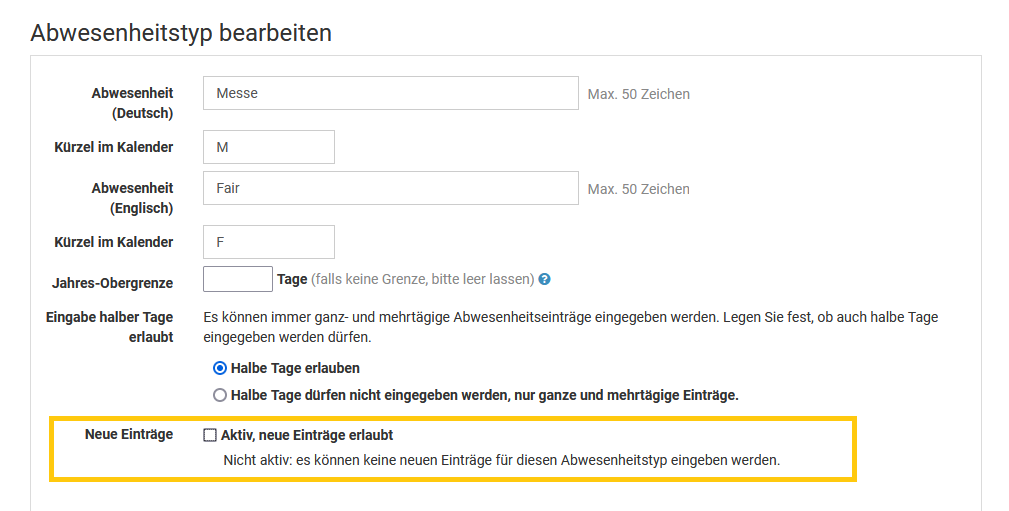 Bearbeiten und Löschen von Abwesenheitseinträgen erlauben