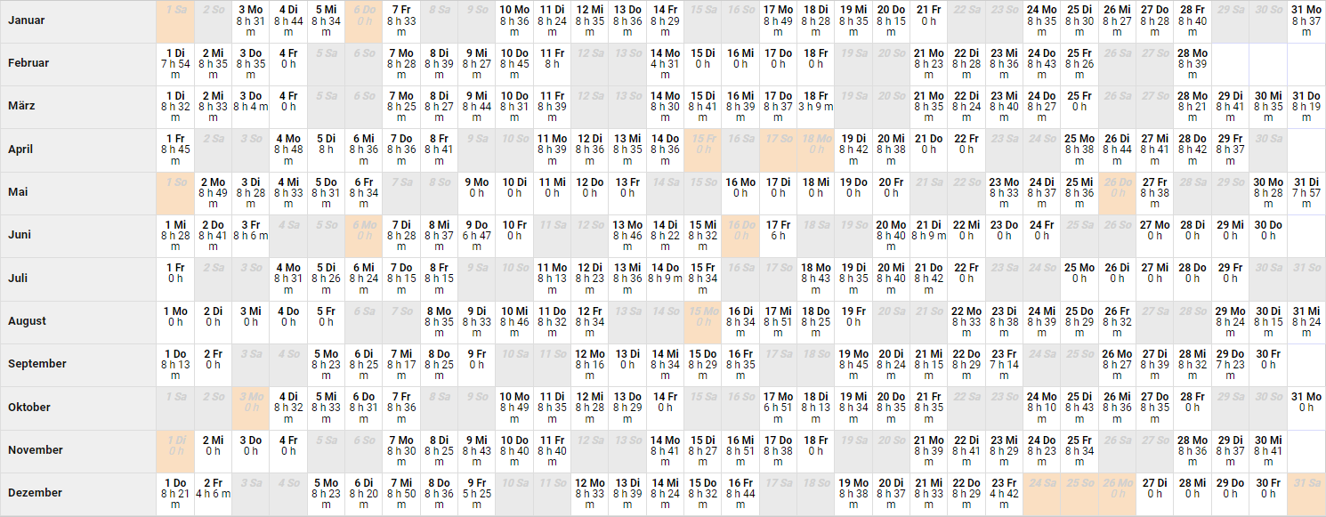 Dazu folgende Beispiele (Annahme: ein Vollzeitmitarbeiter hat Anspruch auf 30 Urlaubstage im Jahr bei einer 5-Tage-Woche zu je 8 Stunden von Montag bis Freitag):