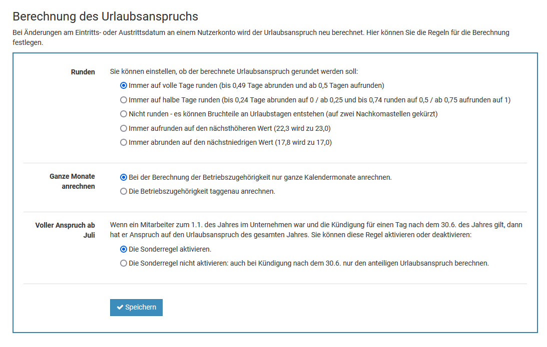 Hinweis:Die Berechnung erfolgt gemäß deutschem Bundesurlaubsgesetz, jedoch ohne Gewähr. Aufgrund von Tarifverträgen, Vereinbarungen im Arbeitsvertrag und anderen Vorgaben können abweichende Vorgaben gelten.