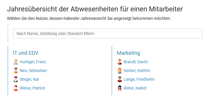 Sie können mit wenigen Mausklicks Abwesenheitseinträge für eine Vielzahl an Mitarbeitern eingeben und dabei beispielsweise eine Dienstreise für mehrere oder alle Mitarbeiter erstellen.
