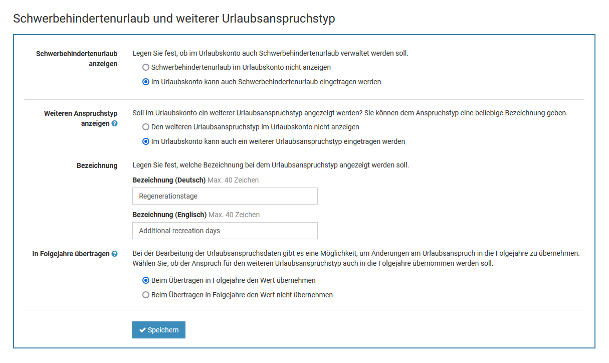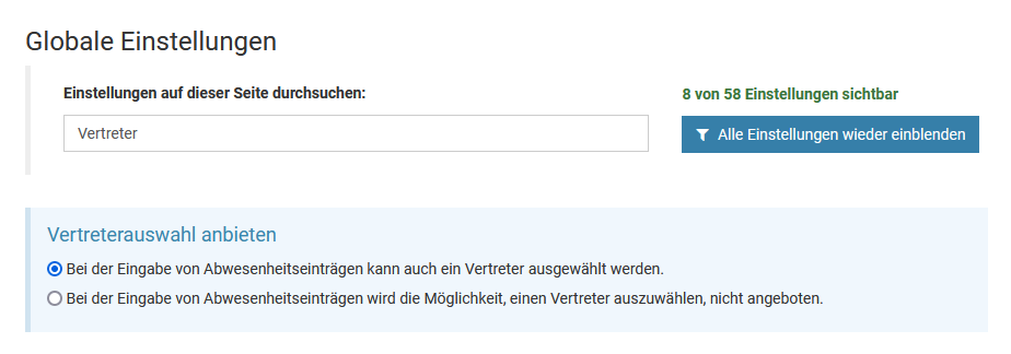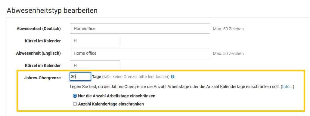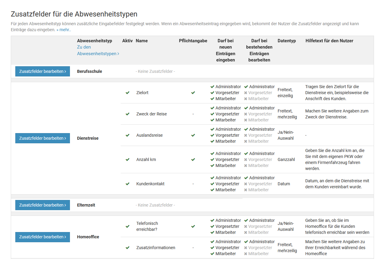 Ein Admin kann für jeden Abwesenheitstyp (Urlaub, Homeoffice, Dienstreise, ...) einstellen, ob dieser