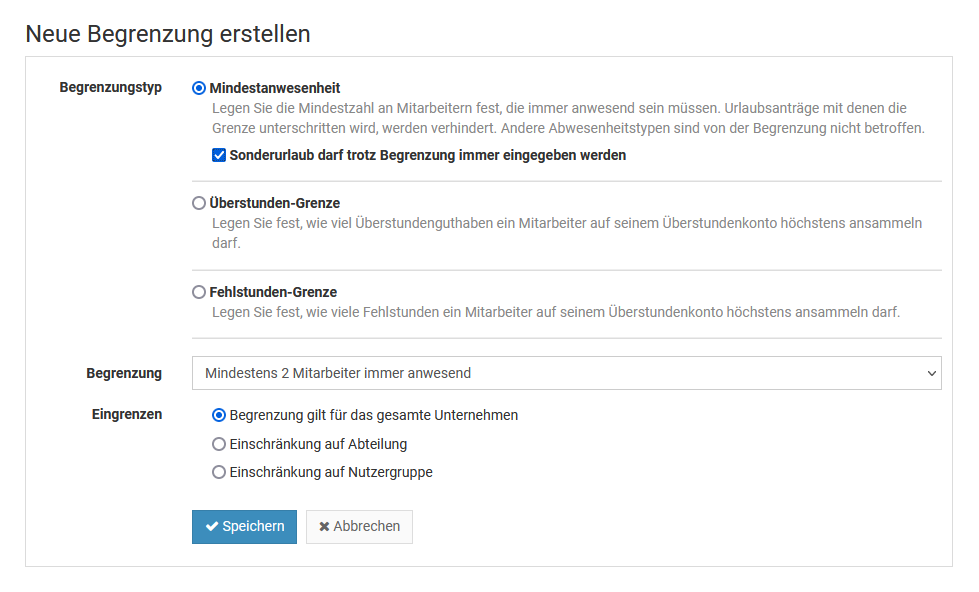 Sie können einstellen, dass in bestimmten Abteilungen oder Nutzergruppen (oder im gesamten Unternehmen) eine bestimmte Anzahl Mitarbeiter immer anwesend sein muss. Timebutler stellt dann sicher, dass nicht zu viele Mitarbeiter gleichzeitig Urlaub nehmen. So können Sie beispielsweise festlegen, dass immer mindestens zwei Mitarbeiter aus der Abteilung "Vertrieb" anwesend sein müssen.