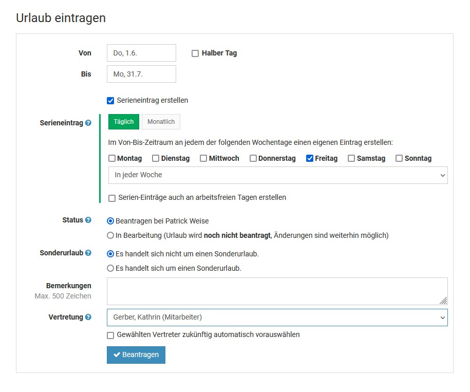 Mitarbeiter-Nutzer und Vorgesetzte erhalten direkt nach der Eintragung der Serieneinträge die Option, die Serieneinträge wieder rückgängig zu machen, also zu löschen. Wenn die Option nicht gewählt wird, dann können die Serieneinträge als ganzes nicht mehr gelöscht werden, sondern es kann nur jeder Eintrag aus der Serie einzeln gelöscht werden.